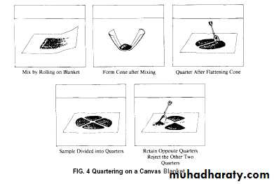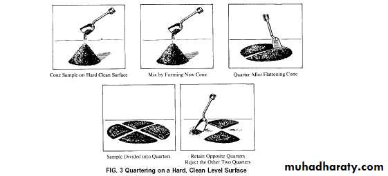 • 6.1.1 Place the original sample on a hard, clean, level surface where there will be neither loss of material nor the accidental addition of foreign material. Mix the material by turning the entire sample over three times. With the last turning, shovel the entire sample into a conical pile. Carefully flatten the conical pile to a uniform thickness and diameter by pressing down the apex with a shovel. The diameter should be approximately four to eight times the thickness. Divide the flattened mass into four equal quarters with a shovel or trowel and remove two diagonally opposite quarters, including all fine material, and brush the cleared spaces clean.