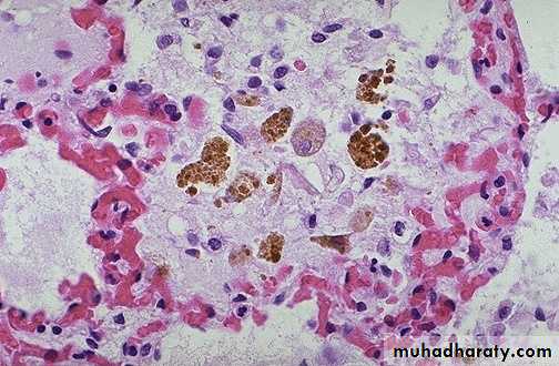 In case of left sided heart failure → raised pressure in the pulmonary veins → alveolar capillaries become distended, engorged with blood, alveolar septal edema and minute intra alveolar hemorrhage → break down of RBCs & phagocytosis of intra-alveolar red cell debris by macrophages leading to accumulation of (hemosidrin –laden macrophages) (heart failure cells) with a transudate in the alveolar spaces.In chronic pulmonary congestion, the septa become thickened and fibrotic.