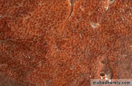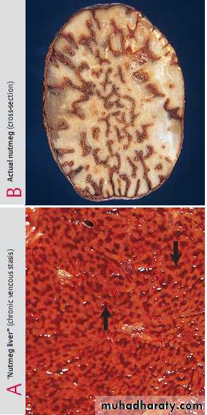 Micro:- the central vein and sinusoids are distended with blood and may be central hepatocyte degeneration; the periportal hepatocytes are better oxygenated because of their proximity to hepatic arterioles, so they are less hypoxic & may develop only fatty changes.Grossly:- central regions of hepatic lobules red-brown surrounding by uncongested tan, some time fatty liver giving it an appearance called "nut meg liver".
