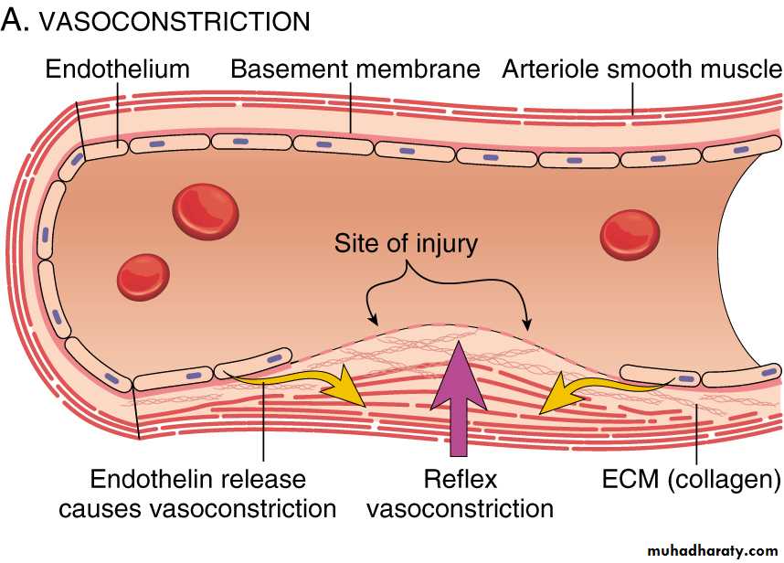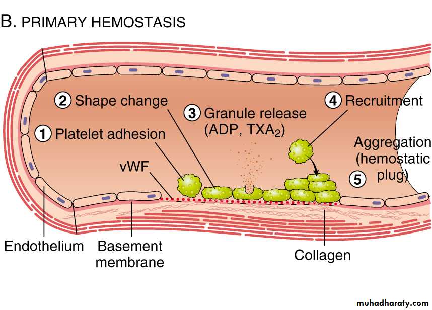 subendothelial extracellular matrix (ECM), then platelets adhere to ECM by VonWillebrand factor and become activated. Activation of platelets results in change of its shape (increase surface expression of phospholipid complex) and release secretory granules (adenosine diphosphate (ADP) and thromboxane A2 (TXA2)) which will lead to the further platelets aggregation, and to form primary hemostatic plug.