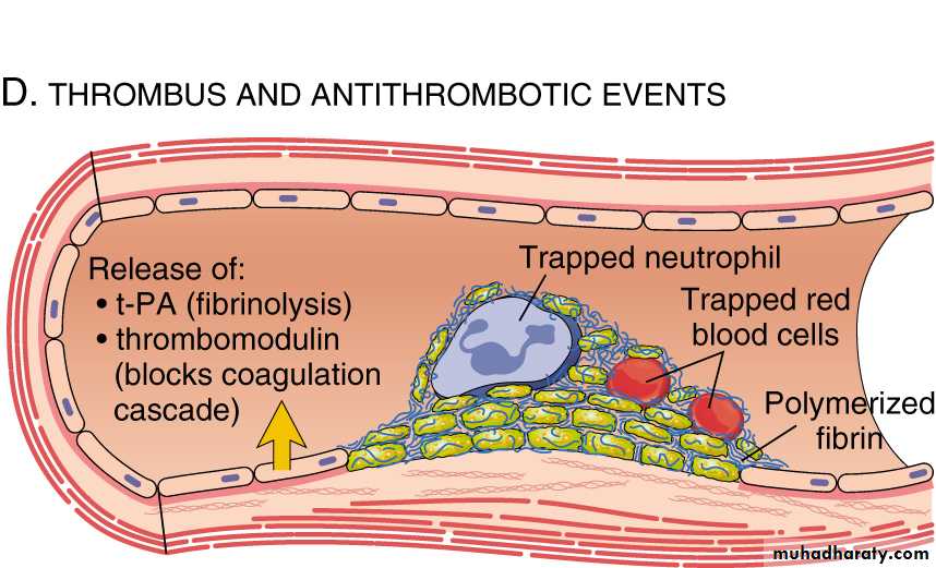 At this stage counter-regulatory mechanisms (tissue plasminogen activator(t-PA) & thrombomodulin) are set into motion to limit the hemostatic plug to the site of injury.