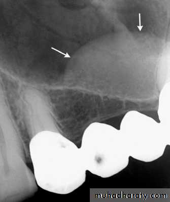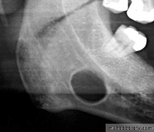 1-Circular or fluid-filled shape, is characteristic of a cyst.2-Scalloped shape is a series of contiguous arcs or semicircles that may reflect the mechanism of growth. This shape may be seen in cysts (e.g., keratocystic odontogenic tumors), cyst like lesions (e.g., simple bone cysts), and some tumors. Occasionally, a lesion with a scalloped periphery is referred to as multilocular.