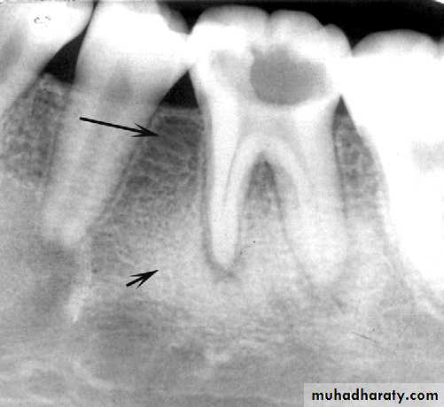 It is important to observe whether the widening is uniform or irregular and whether the lamina dura is still present. For instance, orthodontic movement of teeth results in widening of the periodontal membrane space, but the lamina dura remains intact. Malignant lesions can quickly grow down the ligament space, resulting in an irregular widening and destruction of the lamina duraSurrounding Bone Reaction