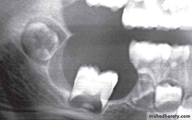 Displacement of teeth is seen more commonly with slower growing, space-occupying lesions.Lesions with an epicenter above the crown of a tooth (i.e., follicular cysts and occasionally odontomas) displace the tooth apically.