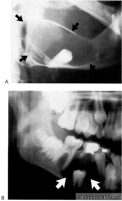 If the epicenter is coronal to a tooth, the lesion probably is composed of odontogenic epithelium