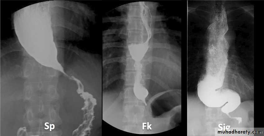 Chest x-ray may be abnormal in late dis., with widening of mediastinum (oesophageal dilatation) and presence of aspiration pneumonitis.Barium swallows . Tapered narrowing (bird beak) of the lower oesophagus and dilating body of oesophagus, a peristaltic and food filled (sigmoid oesophagus).