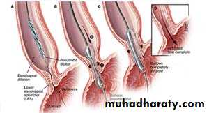 endoscopically:-a. forceful pneumatic dilatation using 30-35 mm diameter fluoroscopically positioned balloon across the gastro esophageal junction. It improves the symptoms in 80% of pt. we face two problems:-