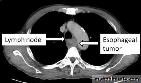 Most patients have a history of painless, progressive dysphagia for solid food or acutely because of food bolus obstruction. Dysphagia is usually rapidly progressive. Pain is usually retrosternal and is due to invasion into the mediastinum (hoarseness is also a symptom). Productive cough may reflex aspiration pneumonia or Broncho esophageal fistula (cough after swallowing)Weight loss is also obvious, anemia usually reflect bleeding or appetite depression, cervical LAP & hepatomegaly (metastasis) are a late symptoms.