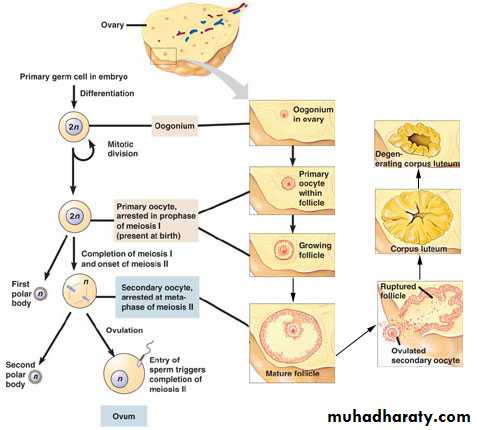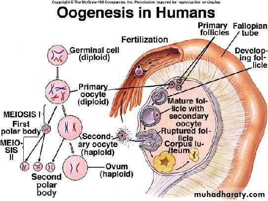Primary oocyte secondary oocyte + first polar body mature ovum tow polar bodies.primordial follicle primary follicle secondary follicle tertiary follicle mature graffian follicle