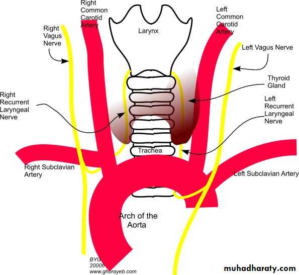 Medial relations; *trachea & oesophagus with RLN in between