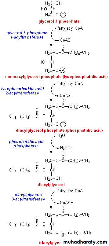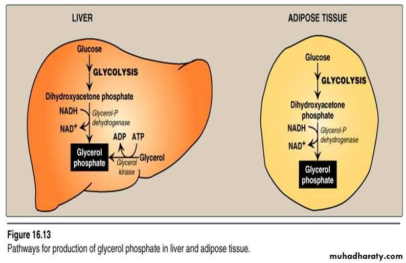 Note:- a- Adipocyte can take up glucose only in the presence of the hormone insulin. Thus, when plasma glucose—and, therefore, plasma insulin—levels are low, adipocytes have only a limited ability to synthesize glycerol phosphate, and cannot produce TAG.]b- A fatty acid must be converted to its activated form(attach to co enzyme A) before it can participate in triacylglycerol synthesis.