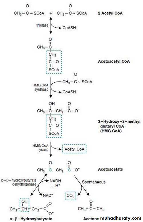 The acetoacetyl CoA will react with acetyl CoA lead to the formation of HMG CoA {beta – or three- hydroxy methyl glutaryl CoA}.This reaction catalyzed by the enzyme HMG CoA synthase. This is the rate limiting step in the formation of the ketone bodies.By the action of the second enzyme HMG CoA Lyase the HMG CoA will be converted to Acetoacetate (the first ketone body).