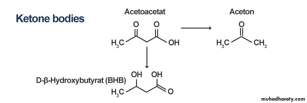 Under certain metabolic conditions associated with high rate of fatty acid oxidation ,the liver produce a considerable quantities of acetoacetate and β-hydroxy butyrate which pass by diffusion from the liver to the blood. Acetoacetate undergo spontaneous decarboxylation to acetone. These three compounds [acetoacetate (acetoacetic acid)+ β hydroxy butyrate+ acetone] are collectively called ketone bodies.