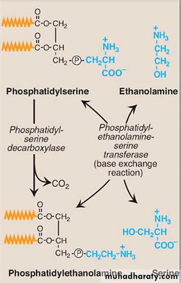 The primary pathway for synthesis of PS in mammalian tissues is provided by the base exchange reaction, in which the ethanolamine of PE is exchanged for free serine. This reaction, although reversible, is used primarily to produce the PS required for membrane synthesis.Phosphatidylinositol (PI):-