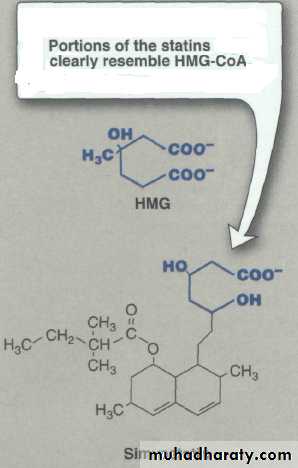 Inhibition by drugs: The statin drugs (atorvastatin, fluvastatin, lovastatin, pravastatin, rosuvastatin, and simvastatin) are structural analogs of HMG CoA, and are (or are metabolized to) reversible, competitive inhibitors of HMG CoA reductase. They are used to decrease plasma cholesterol levels in patients with hypercholesterolemia.