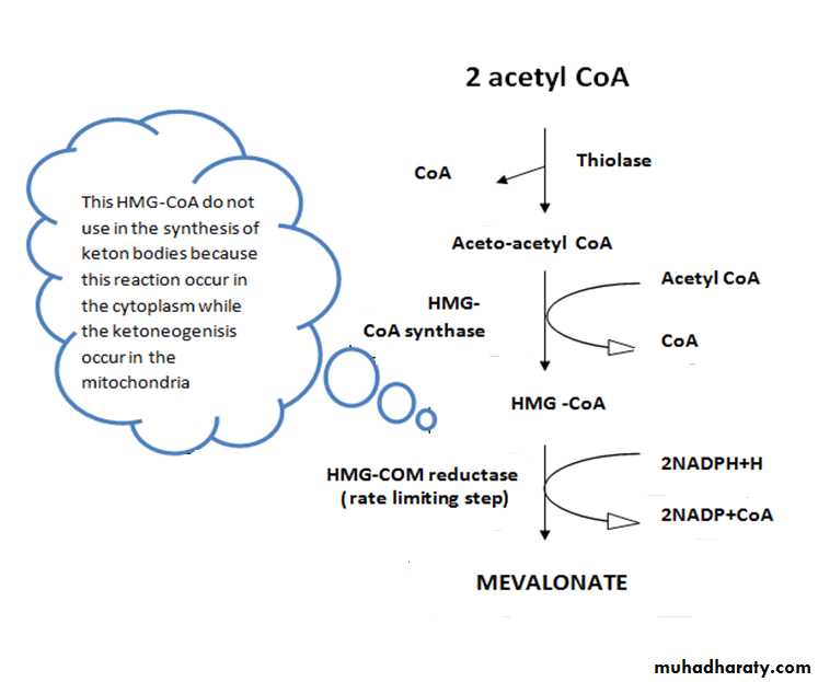 The first two reactions in the cholesterol synthetic pathway are similar to those in the pathway that produces ketone bodies. They result in the production of HMG CoA.