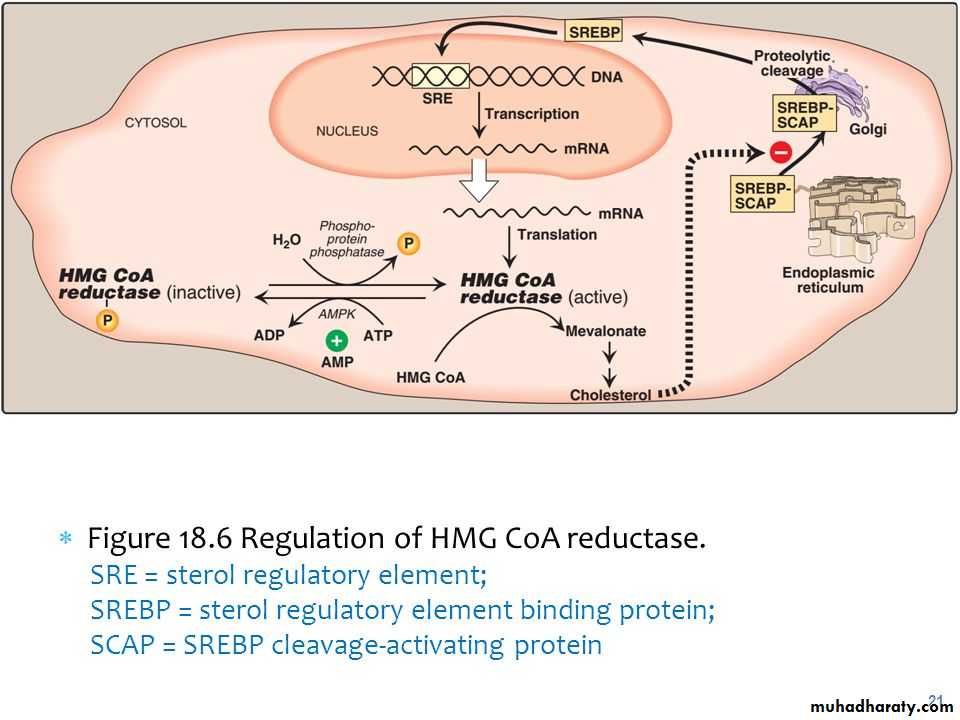 Sterol-independent phosphorylation/dephosphorylation: HMG CoA reductase activity is controlled covalently through the actions of adenosine monophosphate (AMP)–activated protein kinase (AMPK),The phosphorylated form of the enzyme is inactive, whereas the dephosphorylated form is active.