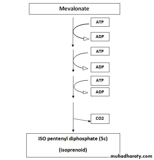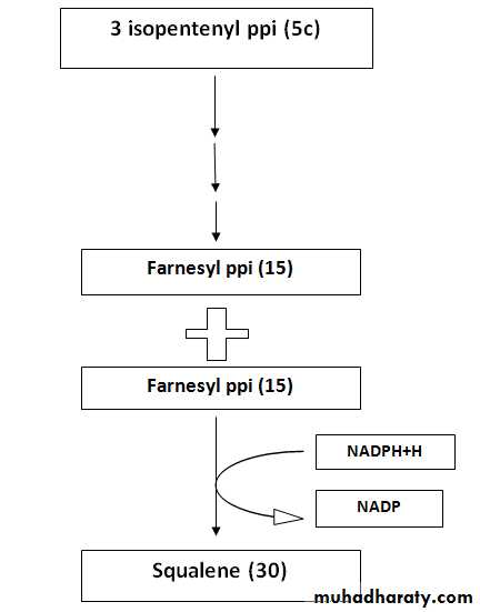 Isoprenoid unit formed from mevalonate in several steps, need 3ATP and loss one carbon as Co2 .3- formation of squalene (30c):