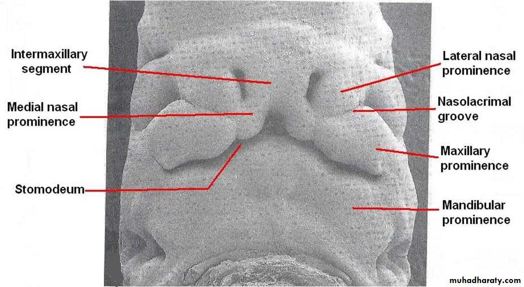 1. The face develops from the fusion of five face primordia which develop during week four and fuse during weeks five-eight. These primordia are ectodermal swellings or prominences of the cranial end of the head and some of its pharyngeal arches. They are filling with proliferating mesoderm and neural crest. They include one midline frontonasal (frontal) prominence, two (bilateral) maxillary prominences (or swellings) and two (bilateral) mandibular prominences (or swellings). The mandibular and maxillary prominences develop from pharyngeal arch I. The frontonasal prominence is not an arch derivative). These prominences encircle the stomodeum, or primitive mouth opening. This opening is originally covered by buccopharyngeal membrane, which is itself formed by fusion of the ectoderm with the underlying endoderm.