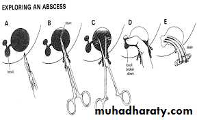 • Stab incision: made over a point of maximum fluctuation in the most dependent area along the skin creases, through skin and subcutaneous tissue.