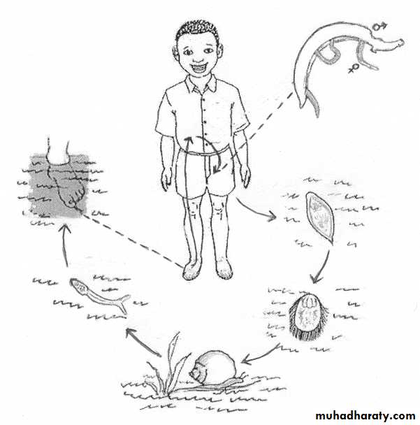 Is caused by atrematode or (fluke) called Schistoma haematobuim that present in egypt ,africa and middle east . a fresh water snail release the infective form of parasite (cercariae) that penetrate the skin and migrate to liver as (schistosomules) where they mature ,adult warm couple migrate to the vesical veins and lay eggs (containing miracidia larvae)that penetrate bladder and enter urine the disease have 2 stage: