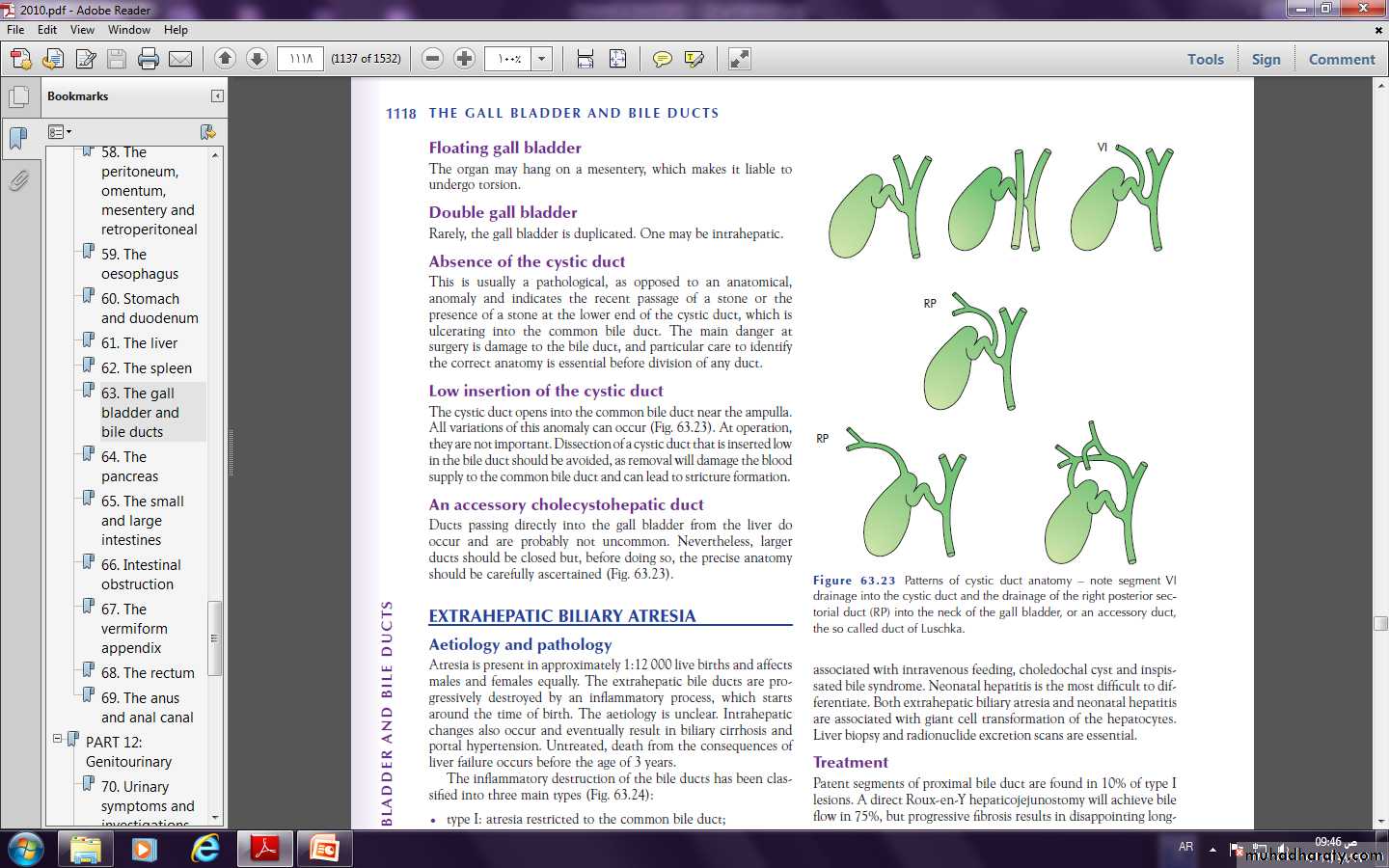 Floating gall bladderThe organ may hang on a mesentery, which makes it liable toundergo torsion.Double gall bladderRarely, the gall bladder is duplicated.Absence of the cystic ductThis is usually a pathological, anomaly and indicates the recent passage of a stone or thepresence of a stone at the lower end of the cystic duct, which is ulcerating into the common bile duct. The main danger at surgery is damage to the bile duct.Low insertion of the cystic ductThe cystic duct opens into the common bile duct near the ampulla.All variations of this anomaly can occur .An accessory cholecystohepatic ductDucts passing directly into the gall bladder from the liver dooccur .