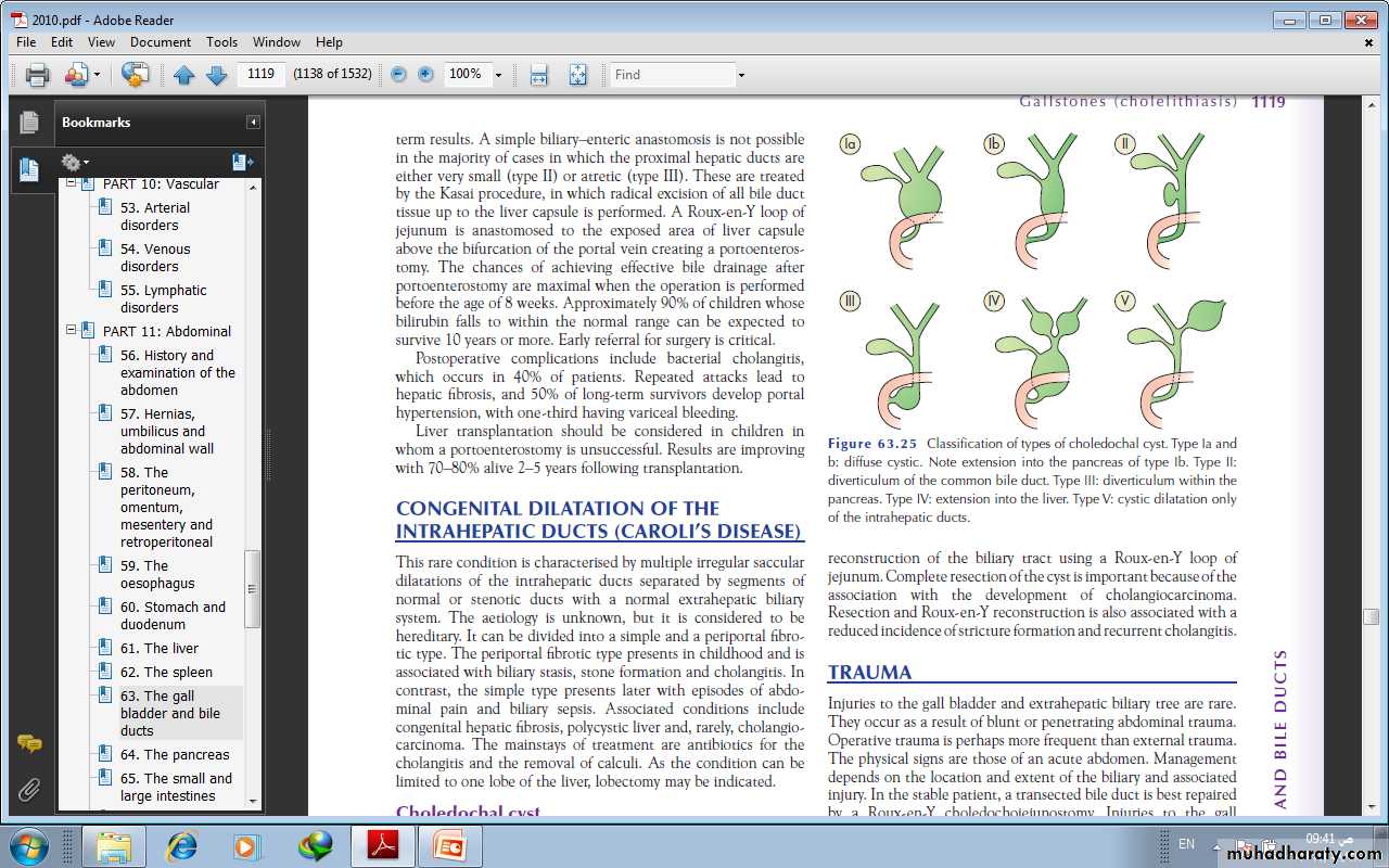 CONGENITAL DILATATION OF THEINTRAHEPATIC DUCTS (CAROLI’S DISEASE)This rare condition is characterised by multiple irregular sacculardilatations of the intrahepatic ducts with a normal extrahepatic biliary system. The aetiology is unknown, but it is considered to behereditary. It can be divided into a simple and a periportal fibrotictype. The periportal fibrotic type presents in childhood and isassociated with biliary stasis, stone formation and cholangitis. Incontrast, the simple type presents later with episodes of abdominalpain and biliary sepsis. Associated conditions include congenital hepatic fibrosis, polycystic liver treatment are antibiotics for the cholangitis and the removal of calculi, lobectomy may be indicated.