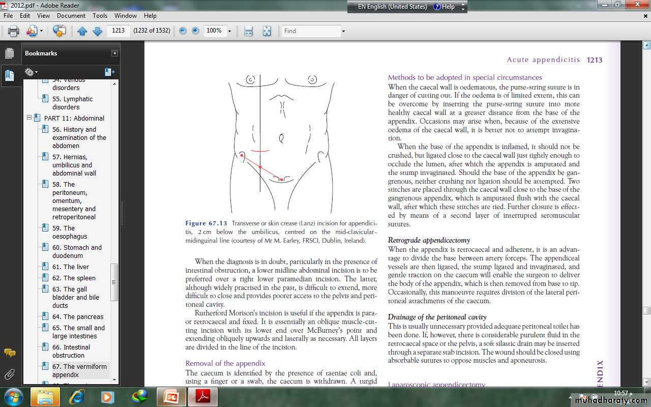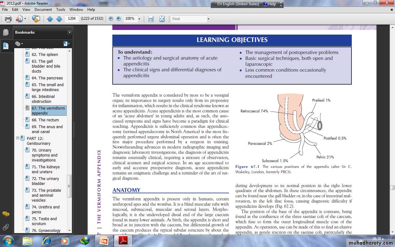 The vermiform appendix is considered by most to be a vestigialorgan; its importance in surgery results only from its propensityfor inflammation, which results in the clinical syndrome known asacute appendicitis. Acute appendicitis is the most common causeof an ‘acute abdomen’ in young adults.It is a blind muscular tube with mucosal, submucosal, muscular and serosal layers. Morphologically,it is the undeveloped distal end of the large caecumfound in many lower animals. At birth, the appendix is short andbroad at its junction with the caecum. The position of the base of the appendix is constant, beingfound at the confluence of the three taeniae coli of the caecum,which fuse to form the outer longitudinal muscle coat of theappendix.