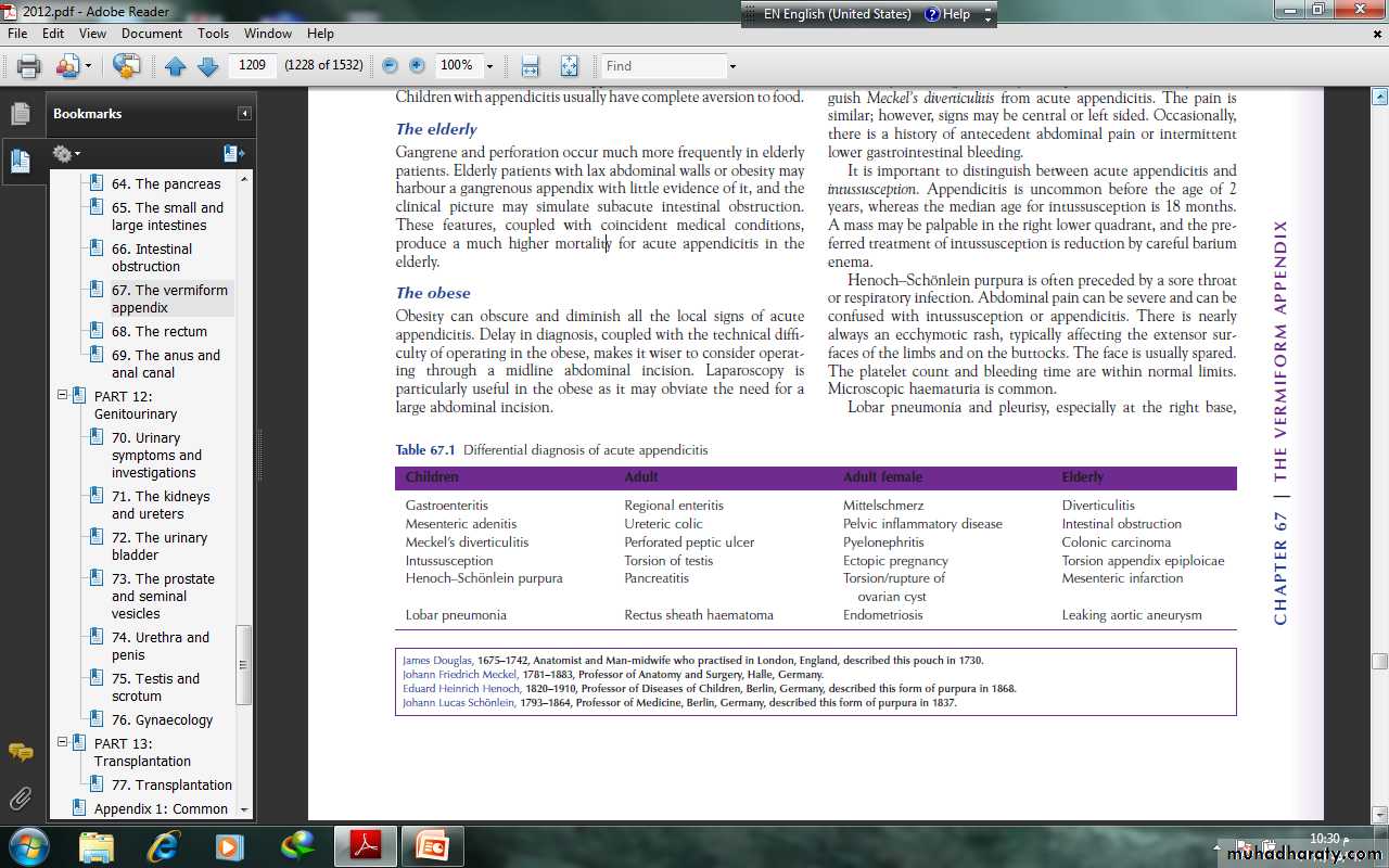 ACUTE APPENDICITISWhile there are isolated reports of perityphlitis (fatal inflammation of the caecal region) from the late 1500s, recognition of acute appendicitis as a clinical entity is attributed to Reginald Fitz, who presented a paper to the first meeting of the Association of American Physicians in 1886 entitled ‘Perforating inflammation of the vermiform appendix’. Soon afterwards, Charles McBurney described the clinical manifestations of acute appendicitis including the point of maximum tenderness in the right iliac fossa that now bears his name.