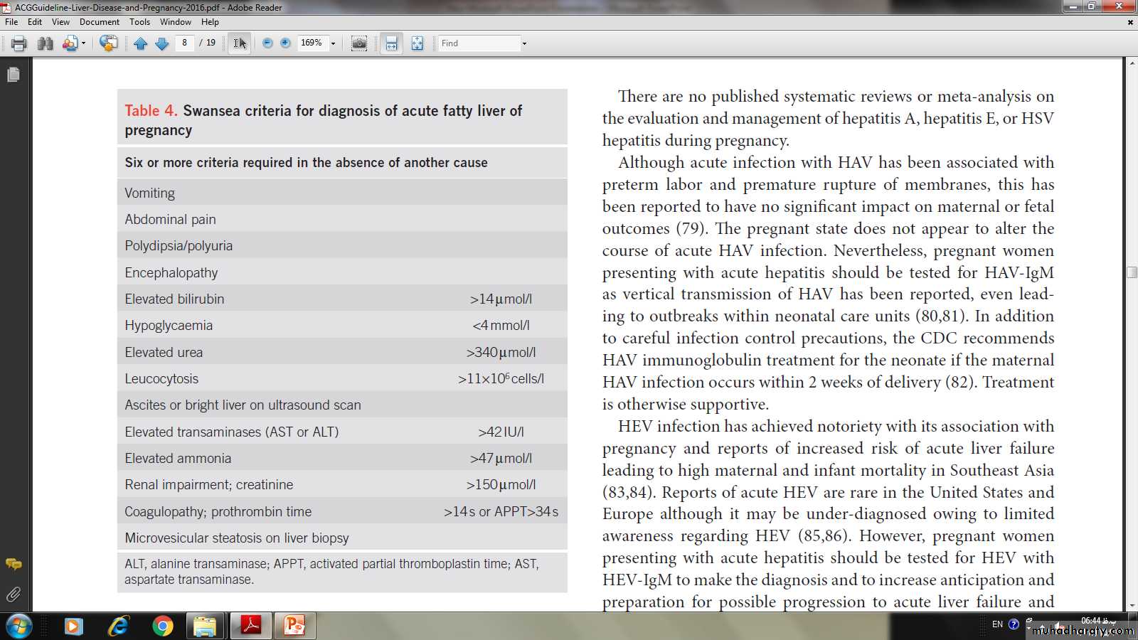 Presenting symptoms are non-specific: nausea, vomiting, and abdominal pain. Concomitant preeclampsia is present in roughly one half of the affected women. Hepatic failure can manifest with signs of hepatic dysfunction such as encephalopathy, coagulopathy, and hypoglycemia. Renal dysfunction and pancreatitis are common.The diagnosis of AFLP is usually made clinically based on compatible presentation, laboratory, and imaging results. The “Swansea Criteria” ( Table 4 ) combine symptoms and laboratory derangements