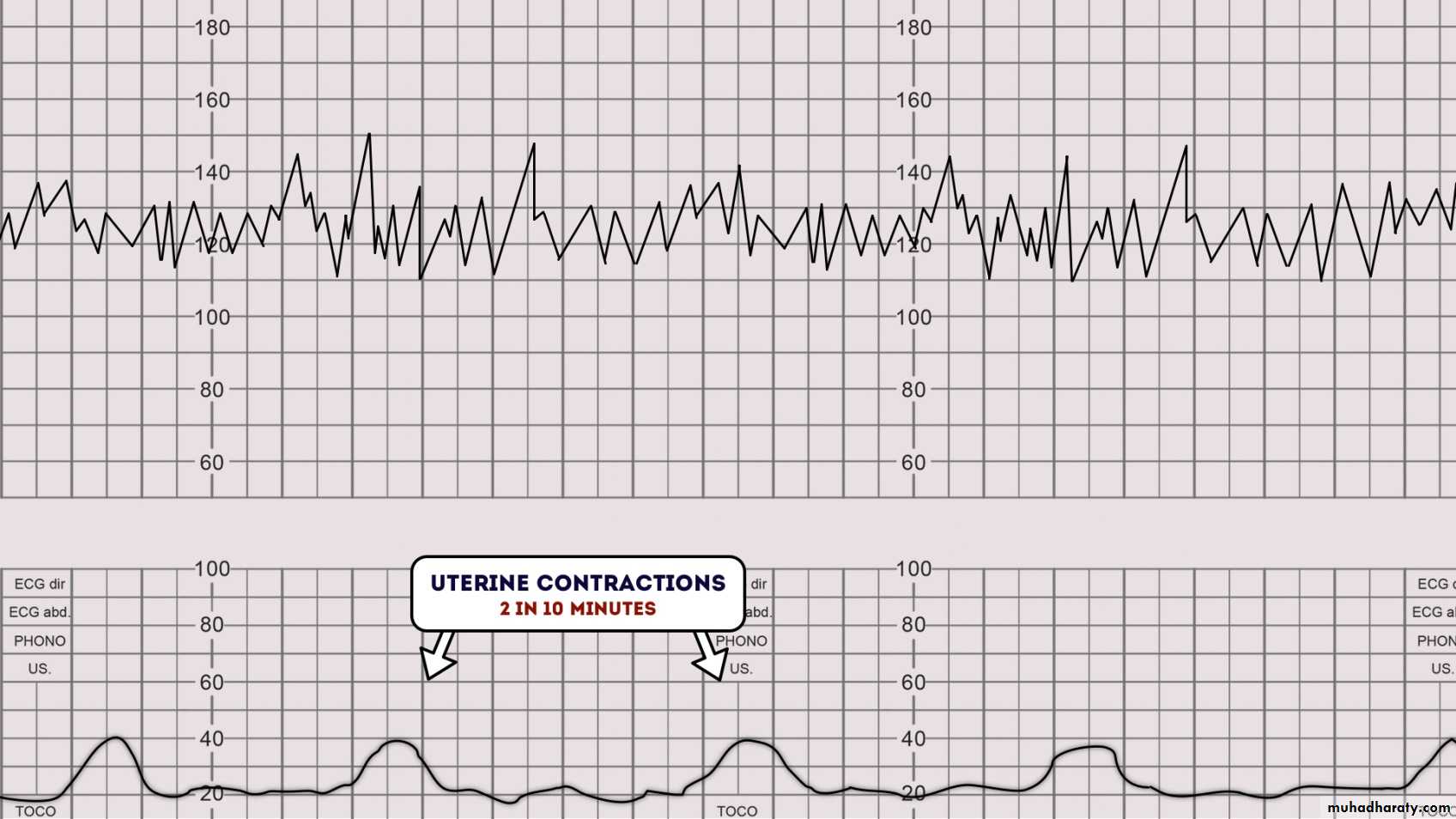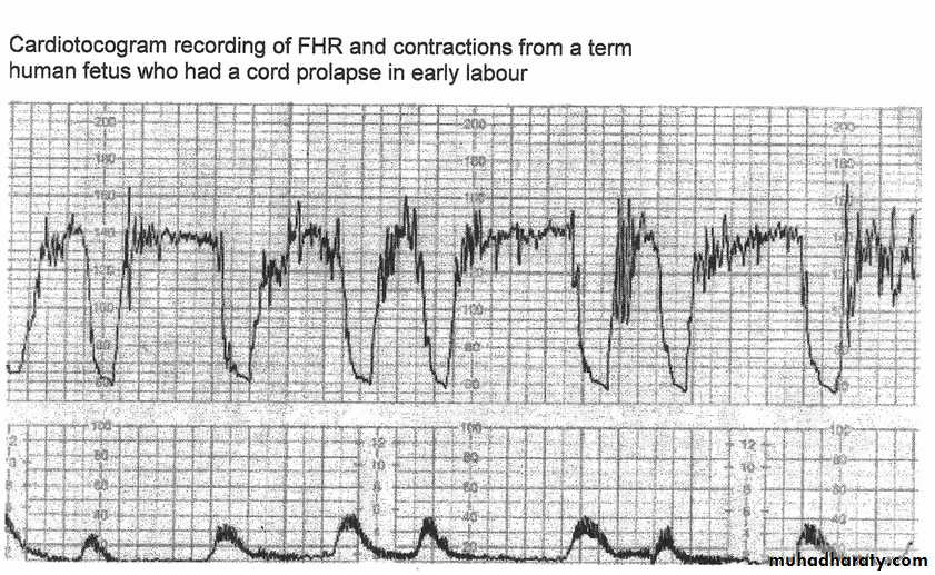 1- Early deceleration : The majority doesn’t fall below 100 bpm , usually is associated with uncomplicated labour , If falls < 100 bpm & is repetitive so pervaginal examination to exclude cord prolapse .