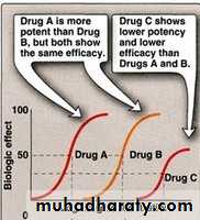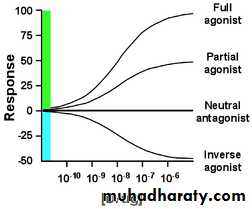 Efficacy: Maximal response that can be elicited by a drugAgonist: An agent which activates a receptor to produce an effect similar to a that of the physiological signal molecule, e.g. Muscarine and Nicotine) Inverse agonist: an agent which activates receptors to produce an effect in the opposite direction to that of the agonist, e.g. DMCM Partial agonist: An agent which activates a receptor to produce submaximal effect but antagonizes the action of a full agonist, e.g. pentazocineAntagonist: an agent which prevents the action of an agonist on a receptor or the subsequent response, but does not have an effect of its own, e.g. atropine and muscarine