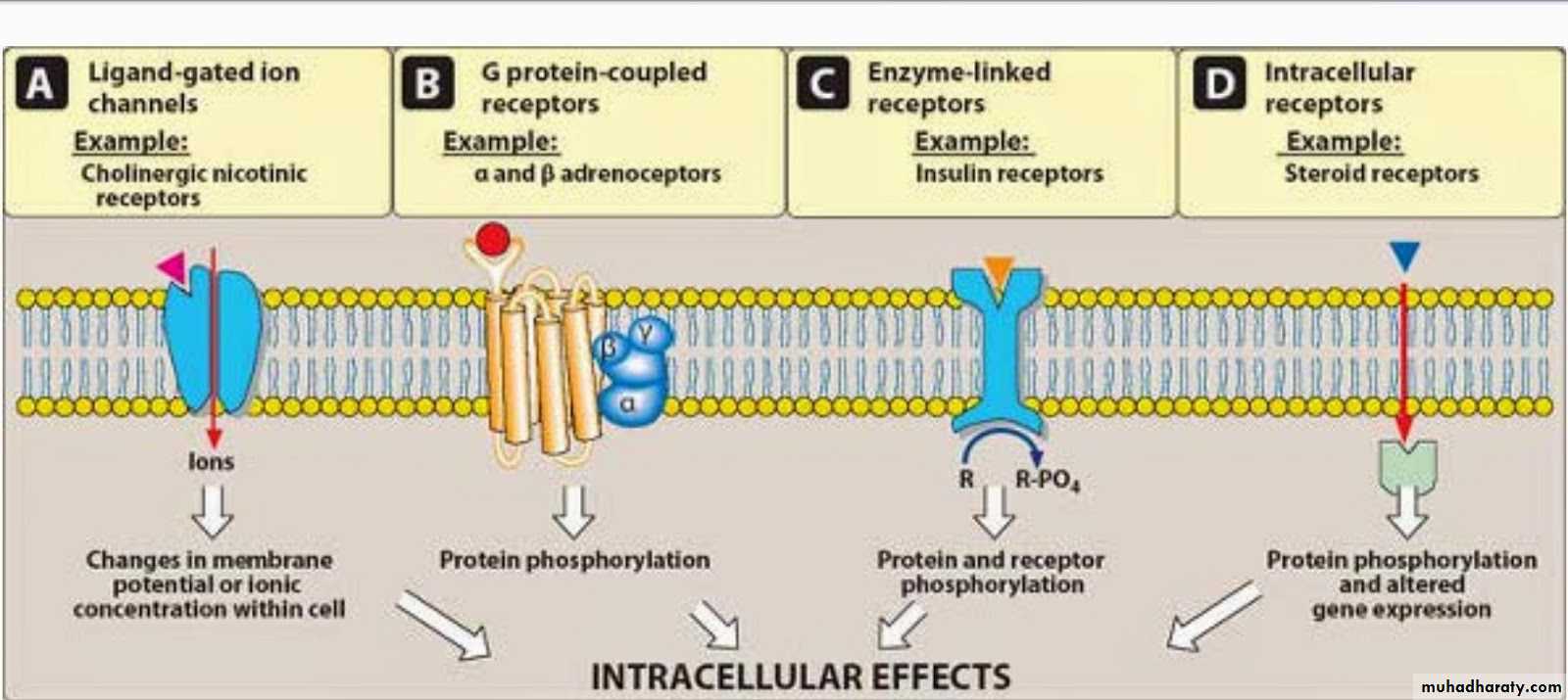 Major Receptor families: A) Ligand-gated ion channel B) G protein-coupled receptor C) Enzyme-linked receptors D) Intracellular receptorsA) Ligand-gated ion channel The most rapid cellular responses to receptor activation are mediated via ligand-gated ion channels. These kind of transmembrane receptors composed of multiple peptide subunits. The ligand binding causes conformational changes of receptor and opening of ion channel. Eg: nicotinic receptorsB) G protein-coupled receptor: It comprised of a single peptide that has seven membrane-spanning r egions.- These receptors are linked to a G Protein (Gs and others) having three subunits, alpha (α) subunit (binds guanosine triphosphate GTP) and a beta-gamma (βY) subunit.- Binding of appropriate ligand to extracellular region of the receptor activates the G Protein, so that GTP replaces guanosine diphosphate GDP on the alpha subunit.-Dissociation of G Protein occurs, and both the alpha-GTP subunit and the βY subunit interact with other cellular effectors (an enzyme or an ion channel). - Effectors then change the concentration of the 2 nd messenger that are responsible for further actions within the cell.-Stimulation of these receptors results in responses last several seconds to minutes