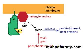 Different G-alpha proteins activate different second messenger pathways1-There are several different classes of trimeric G-proteins that are defined by their different G-alpha subunits. One type of G-alpha activates the enzyme adenylyl cyclase, which catalyzes the formation of the second messenger cyclic AMP (cAMP). Because an activated adenylyl cyclase can generate many molecules of cAMP, this is a means to amplify the signal. cAMP can have several effects, but a major effect is to bind to and activate protein kinase A (PKA; also known as cAMP-dependent kinase). PKA then phosphorylates target proteins in the cell. cAMP is rapidly broken down byphosphodiesterases, limiting the length of the signal.