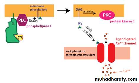 2-Another type of G-alpha activates the enzyme phospholipase C. Phospholipase C cleaves PIP2, a membrane phospholipid, to generate two second messengers, IP3 and diacylglycerol (DAG). IP3 is water soluble, diffusing through the cytosol to bind to and open a ligand-gated Ca++ channel in the endoplasmic reticulum (or sarcoplasmic reticulum in muscle cells). Thus, stimulation of a receptor linked to this G-alpha is a way to increase Ca++ inside the cytosol. Ca++ in the cytosol exerts its effects by binding to Ca++-binding proteins such ascalmodulin. DAG is lipid soluble and stays in the membrane. It activates protein kinase C (PKC), which, like PKA phosphorylates particular target proteins.