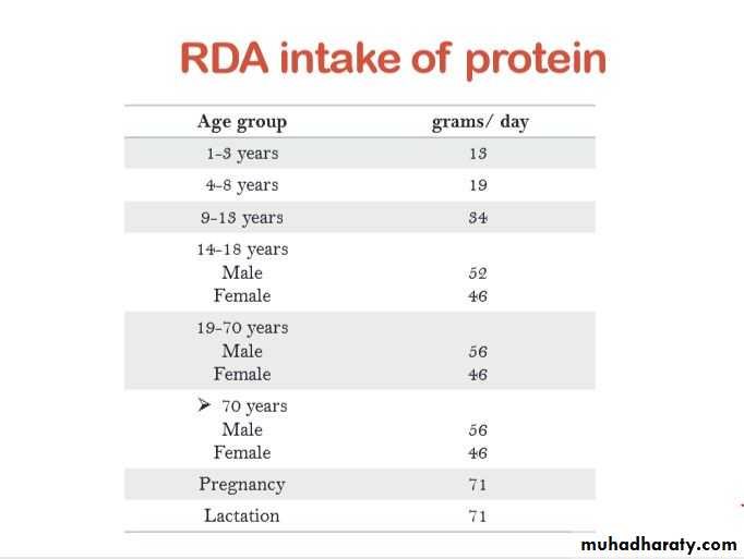 • The are many factors that affect the requirements of protein like age, sex, physical activity, pregnancy and lactation, post- operative recovery, diseases… etc.