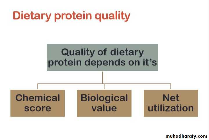 • Chemical score: it refers to the amino acids composition of a protein compared to high quality reference protein (e.g egg).• Biological value: it’s a quantitative measure of protein quality, defined by the amount of nitrogen absorbed and retained in the body, biological value score is out of 100.