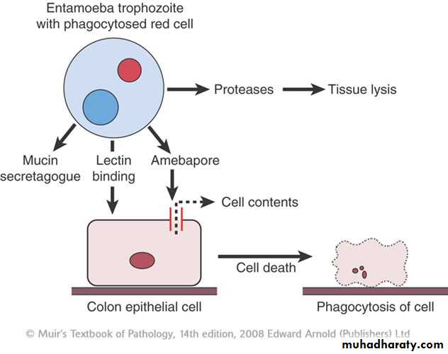 Trophozoites can invade tissue after penetrating through the intestinal mucosa . the cyst lack this ability . trophozoite can come in contact with colonic mucosa when colonic mucus is depleted. Trophozoites attach to interglandular epithelium by surface lectins present on the surface of Entameoba. these lectins attach to receptors on mucosal cells. On contact with these cells trophozoites release phospholipase-A and amoebopore (a pore forming complement – like protein ) this protein responsible for lysis of the cells. And Entameoba produce other enzymes like proteases that degrade collagen , elastin of extracellular matrix and disrupt glycoprotein bonds between mucosal epithelial cells in the gut. The trophozoite can lyse neutrophils , monocytes, lymphocytes and other cells .