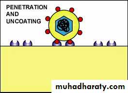 2- Penetration or Entry...: After binding,the cell membrane invaginates around the adsorped virus particle, the virus particle is then engulfed by the cell. In some systems, this is accomplished by receptor-mediated endocytosis, with uptake of the ingested virus particles within endosomes. There are also examples of direct penetration of virus particles across of or fusion of the virion envelope with the plasma membrane.