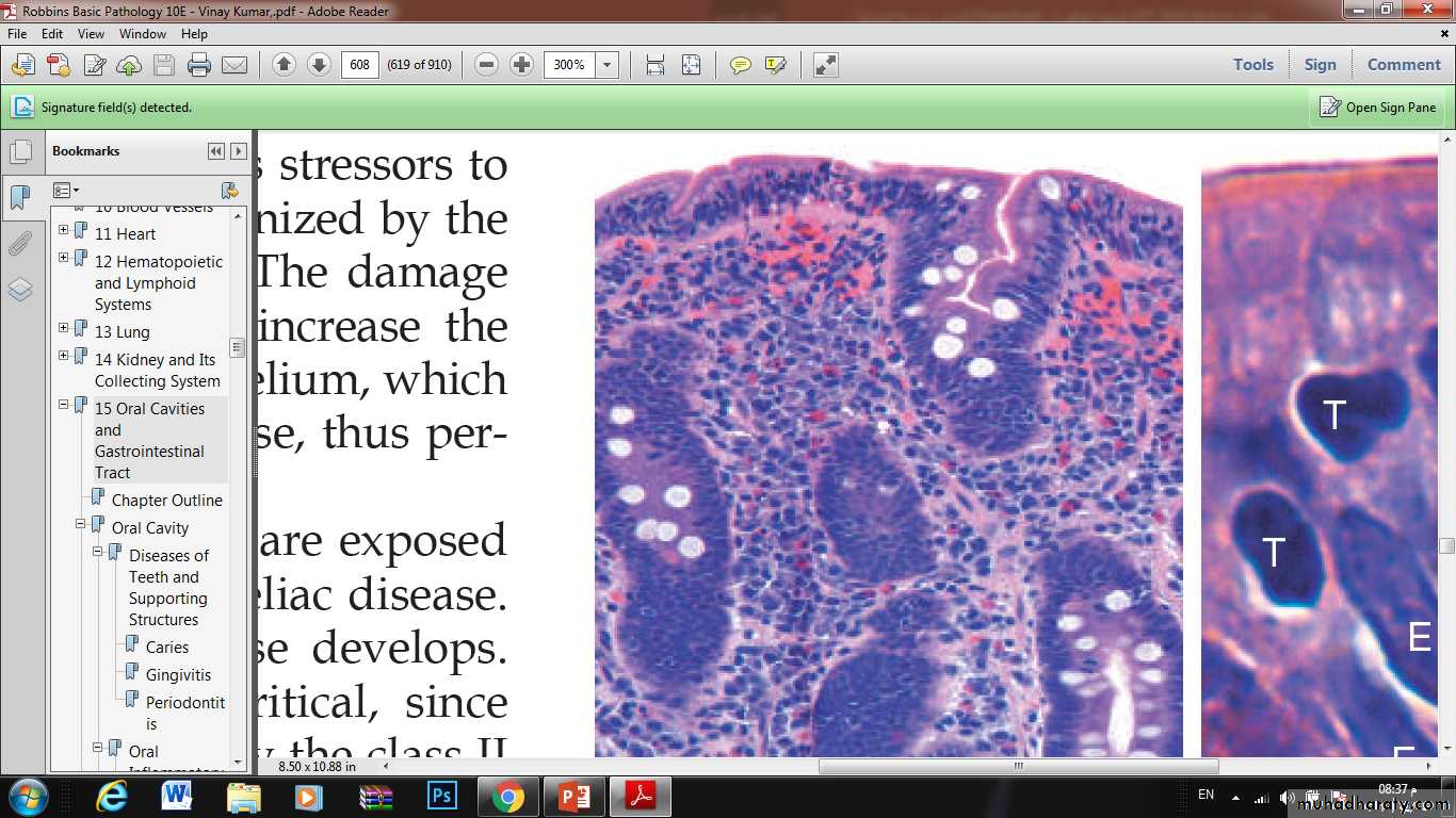 • Advanced cases of celiac disease show completeloss of villi, or total villous atrophy. Note the dense plasma cell infiltratesin the lamina propria.