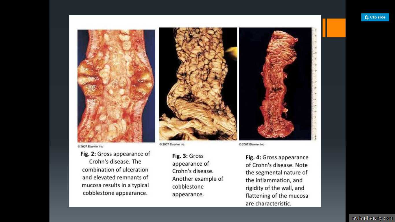 4- A classic feature of CD is the sharp demarcation of diseased bowel segments from adjacent uninvolved bowel. When multiple bowel segments are involved, the intervening bowel is essentially normal (“skip” lesions).