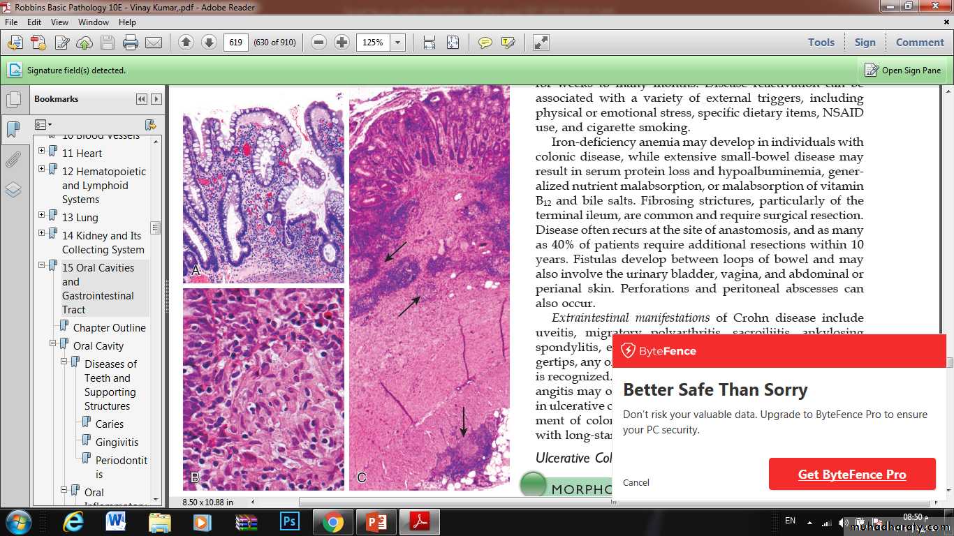 *recurrent episodes of diarrhea, crampy abdominal pain, and fever lasting days to weeks.Microscopic pathology of Crohn disease. (A) Haphazard crypt organization results from repeated injury and regeneration. (B) Noncaseating granuloma. (C) Transmural Crohn disease with submucosal and serosal granulomas (arrows).