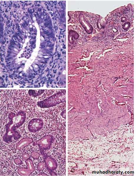 In severe cases, extensive mucosal destruction may be accompanied by ulcers that extend more deeply into the submucosa, but the muscularis propria is rarely involved.