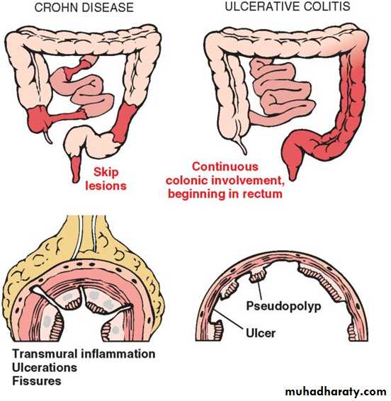 • In UC, well-formed granulomas are absent. • UC does not exhibit skip lesions. • The mucosal ulcers in UC rarely extend below the submucosa,and there is surprisingly little fibrosis. • Mural thickening does not occur in UC.