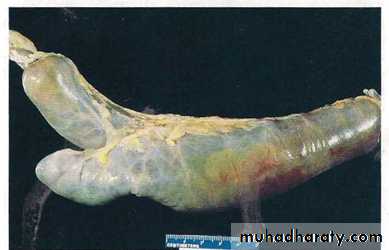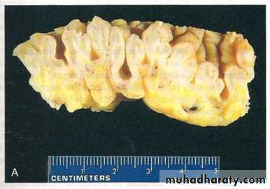 Grossly:• always involves the rectum and extends proximally.
