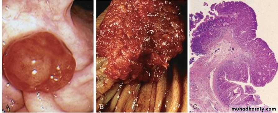 are composed of a broad mix of tubular and villous areas.Colonic adenomas. A, Pedunculated adenoma (endoscopic view). B, Adenoma with a velvety surface. C, Low-magnification photomicrograph of a pedunculated tubular adenoma.