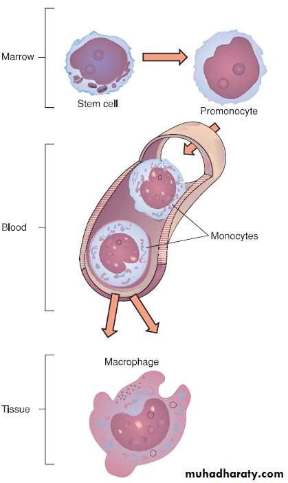 The developmental stages of monocytes and macrophages. The cells progress through maturational stages in the bone marrow and peripheral blood.