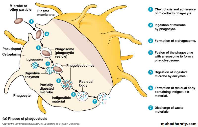 Phagocytes migrate into a region of inflammation attracted by a gradient of stimulant products from the parasite and host tissue at the site of injury.Phagocytosis is often accompanied by opsonization