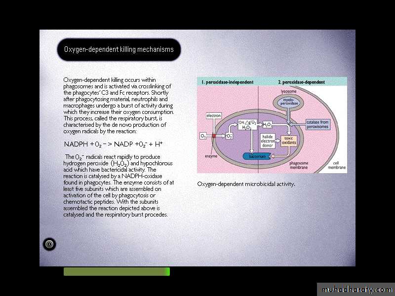 several substances that separately and together have great killing power.Myeloperoxidase, an enzyme found in granulocytes, forms halogen ions (OCl-) that are strong oxidizing agents.