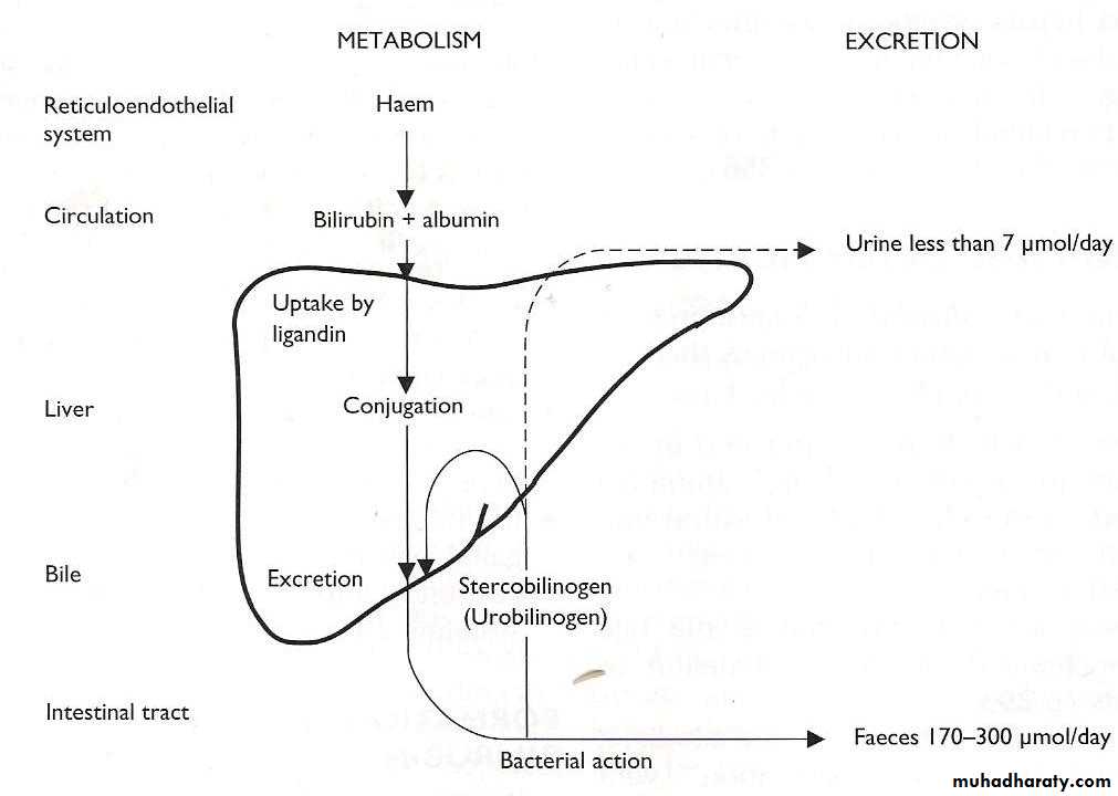 , (Unconjucated bilirubin produced 250-300 ϻmol daily ) from catabolism of haem after removal of iron , while the liver normally able to conjugate up to 1 mmol/ day